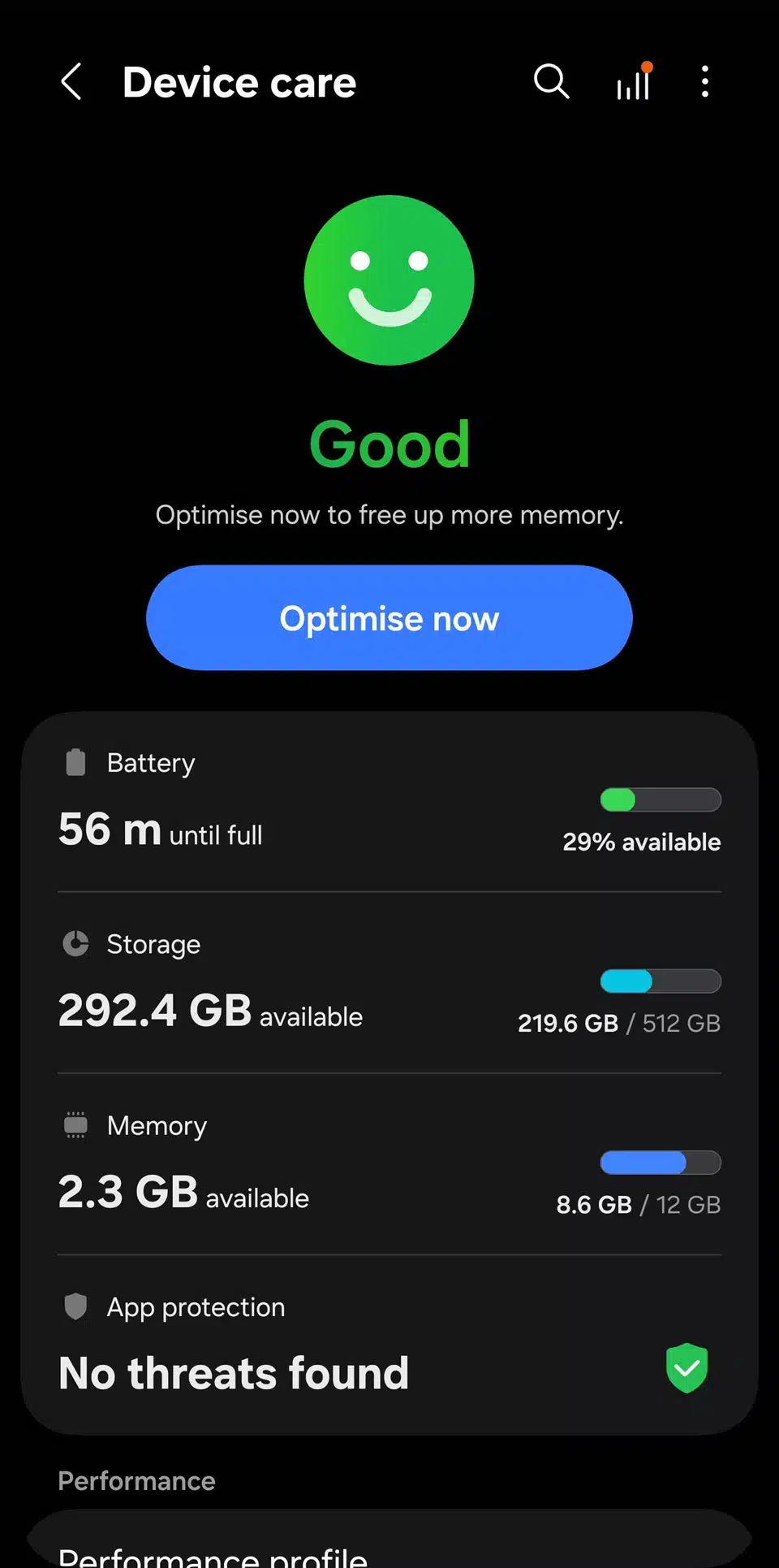 Device Care 页面改版更加注重可视化呈现。过去仅显示存储或内存的剩余空间,新版本将以百分比形式突出已用空间,并配合更宽更显眼的状态条,让用户一眼即可理解设备当前状况。