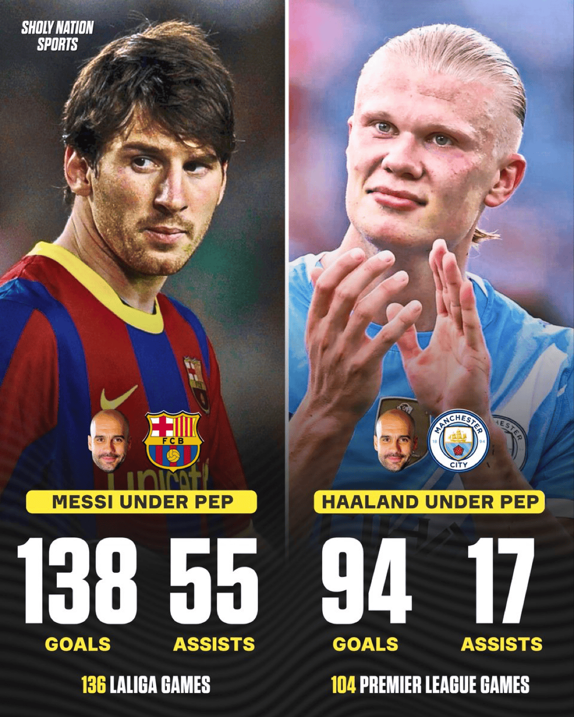 虎扑10月09日讯 国外媒体Sholy Nation Sports统计了梅西、哈兰德在瓜迪奥拉执教时的联赛数据:盈易点